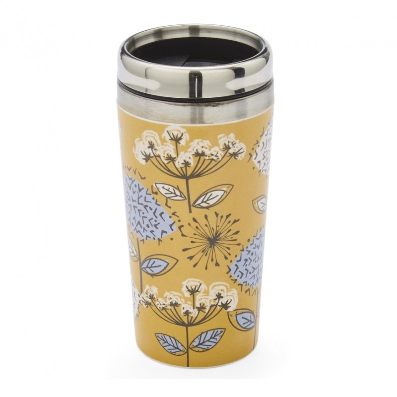 Stainless steel double walled travel mug by Cooksmart with screw on lid and vibrant retro meadow design.